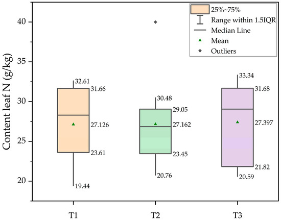 Figure 2 shows the boxplot test for the values of leaf nitrogen concentration in strawberry leaves in the flower induction stage. N concentrations ranged from 19.4 g kg−1 to 33.3 g kg−1. The T1 (50% of the N dose) and T2 (100% of the N dose) treatments exhibit quite similar median and mean values, while the T3 treatment (150% of the N dose) shows a higher trend.