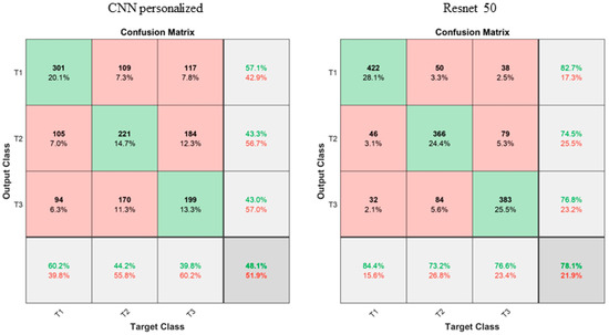 The confusion matrix evaluates the correspondence between the output predicted by the model and the desired output, and then calculates the classification accuracy for each class in a specific class, thus revealing the strengths and weaknesses of the model [38]. The rating rate using personalized CNN was 48.1%, while for ResNet-50 it was 78.1%. Analysis of the matrices for the personalized CNN and ResNet-50 models, as described in Figure 3, reveals distinct patterns in the classification capacity of the treatments (T1, T2, and T3). For personalized CNN, the performance was not satisfactory in view of the fact that the model got more wrong than it got right. Strategies could be explored to improve the outcome of the model, such as optimizing the hyperparameters, including filter size, number of layers and learning rate [39]. As for ResNet-50, it performed better, as it extracts patterns from more complex spectral features [40]; the rate of correct answers was higher in this model, reaching 78% accuracy. For both networks, T1 was the one with the highest rate of correct answers, with 60.2% and 84.4%, respectively, for the personalized CNN and ResNet-50; this was possibly due to the symptom of nutritional deficiency, expressed as a uniform chlorosis, which allowed the model to classify more assertively.