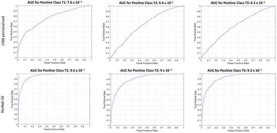 A comparison of the AUC analyses is shown in Figure 4. First, for the customized CNN, the result was not satisfactory for floral induction, remaining within a range of 0.57 to 0.64, except for T1. As the phenological stage of the plant advances, an increase in leaf chlorosis can be observed due to differences in nitrogen concentration between the treatments. The coloration of the plant’s leaf can be influenced in a variety of ways, depending on the availability of nitrogen. In nitrogen deficiency, leaves tend to become paler, yellowish, or light greenish, due to the reduction in chlorophyll synthesis, which is responsible for the green coloration of leaves, and excess nitrogen can lead to a very dark green color of leaves and excessive vegetative growth [41].