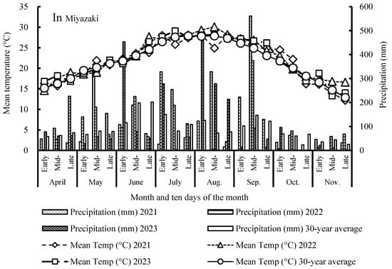 The study was conducted in the experimental fields of the Faculty of Agriculture, University of Miyazaki (31°49′39″ N, 131°24′46″ E, 27 m above sea level), from April 2021 to November 2023. Based on data collected by the Japan Meteorological Agency [20], daily mean temperature and cumulative precipitation in the growing season from April to November were 21.9 °C and 2752 mm, 22.6 °C and 2549 mm, and 22.3 °C and 2493 mm in 2021, 2022 and 2023, respectively, which was higher than the 30-year average of 21.8 °C and 2227 mm (Figure 1). In 2021, Typhoon No. 9 hit the area in early-mid August, causing abundant rainfall (>320 mm), and in mid-September of the same year, an active autumn rain front was associated with more than 560 mm of rainfall. The autumn temperature tended to be higher from mid-September to mid-October in 2021 when the 10-day mean temperature was above 22 °C. Typhoon No. 14 in 2022 hit Miyazaki in mid-September, causing rainfall to exceed 370 mm. In 2023, Typhoon No. 6 approached Miyazaki in early August, causing more than 450 mm of rainfall, and this was followed by more than 450 mm in early June due to the ‘Baiu’ rainy season. The field was flooding on the day of Typhoon No. 6, 9 August 2023, while the flooding water disappeared due to highly permeable volcanic ash soils on the following day, August 10. In the summer sowing maize season, the unusually high temperature of 26 °C extended from early August to late September. No symptom of drought damage was found in maize across three sowing seasons, fitting to the minimum requirement of precipitation in all growing seasons, every year.