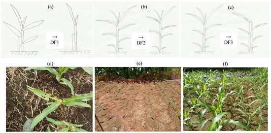 Methods of defoliation treatments in (a) DF1 (defoliation of the 1st–3rd expanded leaves at the 3rd–4th leaf stage), (b) DF2 (defoliation of the 5th–6th expanded leaves by leaf punch at the 6th–7th leaf stage) and (c) DF3 (defoliation of the expanding leaves in addition to DF2 treatment at the 6th–7th leaf stage) and (d) the impact of FAW at the 6th–7th leaf stage in the field, and the experimental field in (e) DF1 plot (Center) at the 3rd–4th leaf stage, and (f) DF2 (Left) and DF3 (Right) plots at the 6th–7th leaf stage.