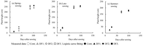 Changes in plant height over time (days) after sowing and the logistic curve fitting (y = K/(1 + bexp(-ax))) between days after sowing (x) and plant height (y) across defoliation treatments (DF1, DF2 and DF3) and a no-treatment control (Cont) for three cropping seasons in 2022. Cropping seasons: spring sowing, planted in early April; late sowing, planted in early June; and summer sowing, planted in early August. Defoliation treatments: Cont (no treatment); DF1 (defoliation of the 1st–3rd expanded leaves at the 3rd–4th leaf stage); DF2 (defoliation of the 5th–6th expanded leaves by leaf punch at the 6th–7th leaf stage); and DF3 (defoliation of the expanding leaves in addition to DF2 treatment at the 6th–7th leaf stage).
