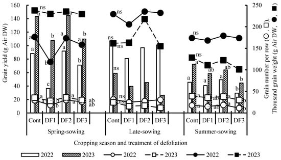 Grain yield and grain yield components at harvest in the defoliation treatments for three cropping seasons, 2021–2023. For details on cropping seasons and defoliation treatments, refer to the footnote of Figure 3. Symbols followed by the same letter indicate no significant difference between defoliation treatments in the same year at the 5% probability level, according to Fisher’s least significant difference test. ns: not significant (p > 0.05).