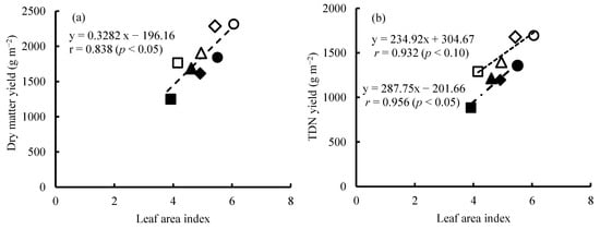 Relationship between leaf area index at the silking stage and plant dry matter yield (a) and total digestible nutrient (TDN) yield (b) in 2023. Defoliation treatments: Cont (○, ●); DF1 (△, ▲); DF2 (◇, ◆); and DF3 (□, ■). Cropping seasons: spring sowing (○, △, ◇, □) and summer sowing (●, ▲, ◆, ■). Note: plant leaf area measurements were not possible for the late sowing season due to plant lodging caused by typhoon damage.