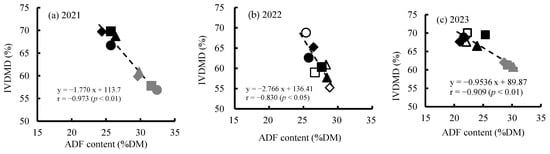 Relationship between acid detergent fiber (ADF) content and in vitro dry matter digestibility (IVDMD) at harvest in 2021 (a), 2022 (b) and 2023 (c). Defoliation treatments: Cont (○, ●, ●); DF1 (△, ▲, ▲); DF2 (◇, ◆, ◆) and DF3 (□, ■, ■). Cropping seasons: spring sowing (○, △, ◇, □); late sowing (●, ▲, ◆, ■); and summer sowing (●, ▲, ◆, ■).
