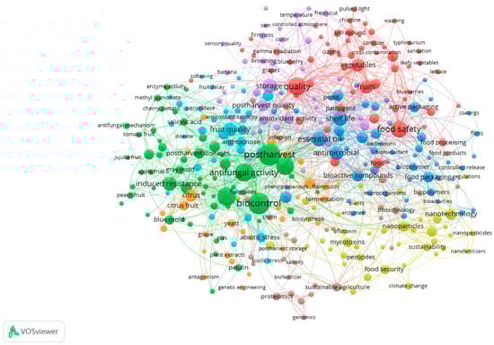 On the other hand, the essential oils were evaluated under the same analysis, yielding 2798 results, classified into nine clusters (see Figure 3B). Cluster two (green) exhibits the highest co-occurrence, primarily with the term “antifungal activity”, which further leads to related terms such as “post-harvest decay”, “mycotoxins”, “antioxidant enzymes”, and “fungi”. Consequently, research is this area focuses on studying the efficacy of essential oil treatments against various phytopathogens affecting the post-harvest conditions of fruits and vegetables. From the keyword “post-harvest” (cluster four, light green) derived terms such as “quality”, “antimicrobial”, “storage”, “citral”, “eugenol”, and “fungicide”, indicating investigations focusing on the utilization of specific essential oil compounds during the post-harvest period and storage of fruits due to their antimicrobial activity. Lastly, cluster six (light blue), originating from terms like “encapsulation”, “nanotechnology”, “post-harvest quality”, “agriculture”, and “biopolymers”, highlights the emphasis on the use of chitosan treatments and essential oils and their integration with nanotechnological tools in modern agriculture.