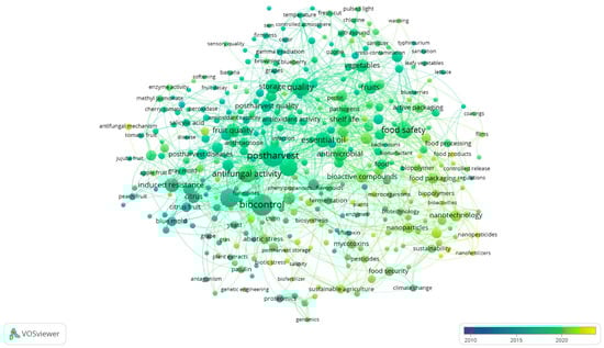 In addition, an analysis was conducted to explore the relationship between two post-harvest technologies, chitosan and essential oils. This is shown in Figure 3, detailing the co-occurrence results over the period of research spanning from 2010 to 2023, with a total of 2497 results for the analysis of “chitosan”, “post-harvest”, and “treatments”, classified into six clusters (see Figure 3A). Notably, cluster one (red) exhibits the highest co-occurrence, with terms such as “induced resistance” related to words like “gene expression”, “oligochitosan”, “methyl jasmonate”, “defense response”, “reactive oxygen species”, and “transcriptome”. This suggests that the use of chitosan technology may interfere with the natural defense mechanisms of fruits and their interaction with various pathogens. This finding is linked to cluster three (blue), focusing on “fruit quality”, and cluster five (purple), emphasizing “shelf life”. Consequently, from the properties and mechanisms of chitosan, it can be inferred that it contributes to extending the shelf life of fruits during the post-harvest period. Furthermore, cluster two (green), highlights the relationship with terms such as “encapsulation”, “nanotechnology”, “nanoparticles”, “antifungal activity”, and “biological control”, indicating the adaptation of new encapsulation technologies and their combination with treatments derived from essential oils. This relationship also extends to cluster four (light green), emphasizing “edible coatings”, and cluster six (light blue), focusing on “antimicrobial” properties.