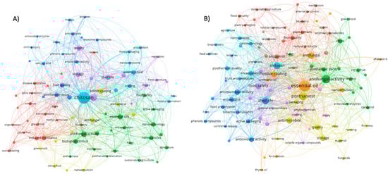 Bibliometric analysis of keywords: (A) “chitosan”, “post-harvest”, and “treatments”; and (B) “essential oils”, “post-harvest”, and “treatments”. Larger circles refer to topics with greater co-occurrence, and smaller circles refer to topics with less co-occurrence.
