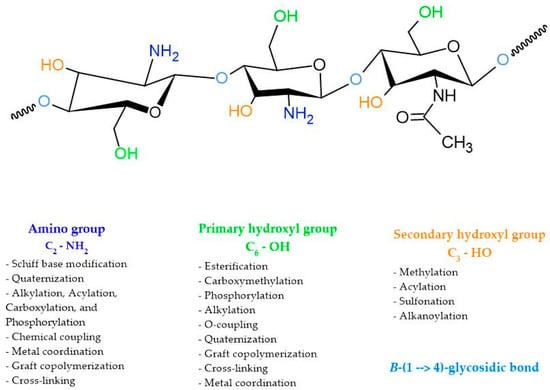 Obtained primarily from natural sources of chitin such as marine crustacean shells, insects, and certain fungi of the Zygomycetes class [33], chitosan undergoes a thermos-alkaline deacetylation process. This process wields a polymer with a high degree of reactivity, due to the presence of amino and hydroxyl groups within its chemical structure [34,35,36]. These functional groups, which are the primary hydroxyl group (OH) at position C-6, the secondary hydroxyl group (HO) at position C-3, and the amino group (NH2) at position C-2, contribute significantly to chitosan´s biological properties. Modifications are often made at the C-2 and C-6 positions to enhance its efficacy as a treatment and its ability to bind with other compounds (see Figure 4) [30,37].