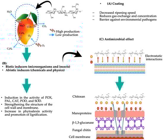 Proposed mechanisms of action of chitosan: (A) coating effect; (B) induction of natural defense mechanisms; and (C) antimicrobial effect.