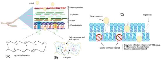 Proposed mechanism of action of citral in fungal cells: (A) deformation and dehydration of hyphae; (B) effects on cellular metabolism; and (C) interaction of citral with the ergosterol molecules present in the cell membrane of pathogenic fungi.