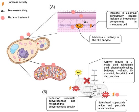 Proposed mechanism of action of hexanal against pathogenic microorganism: (A) effect on membrane cell and lipophilic enzymes’ activity; and (B) changes in mitochondrial activity and the TCA cycle.