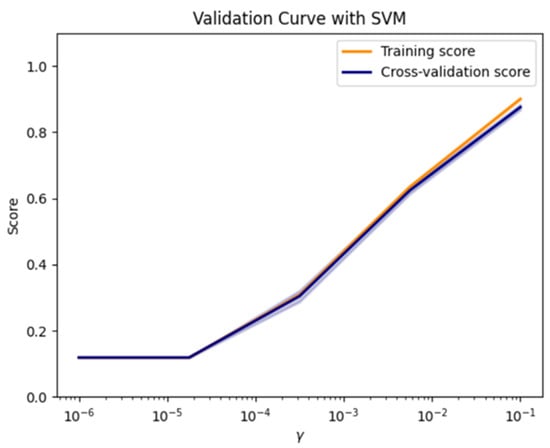 In total, six color features, seven shape features, and two texture features are extracted during these training steps. In Figure 3, the training and validation scores of the SVM model are displayed for various values of the kernel hyperparameter When is set to low values (, ), both the training and validation scores remain notably low at around 0.24, suggesting that the model is underfitted. However, as increases, the training and validation scores gradually improve, peaking at 0.955.
