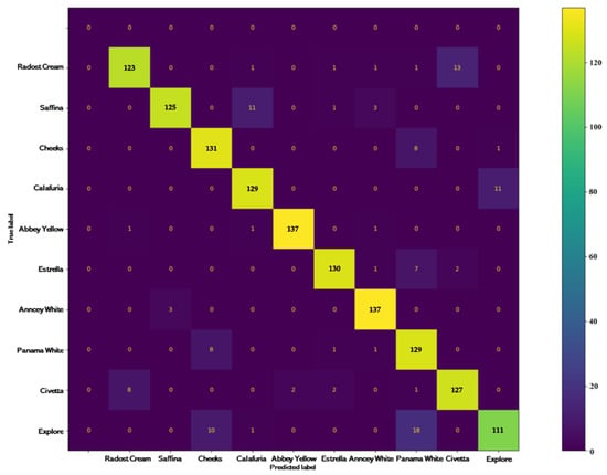 Figure 5 presents the confusion matrix illustrating the comparison between the predicted and the true labels for each cultivar. Overall, the model demonstrated a high classification accuracy rate, surpassing 97% for Abbey Yellow and Anncey White. The second highest rates of classification accuracy are over 92% for Cheeks, Calafuria, Estrella, and Panama White. The third highest rates of classification accuracy are over 89% for Radost Cream, Saffina, and Civetta. However, it displayed provisional performance for Explore, with an accuracy of 79%.