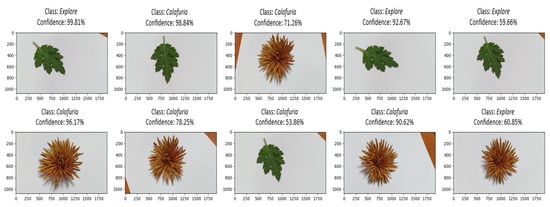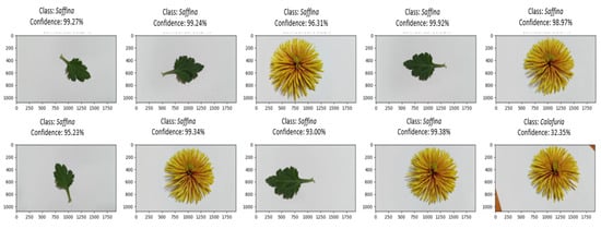 For the Estrella cultivar (Figure 7), both leaf and flower classifications exhibited high confidence, with only minor misclassifications observed for the Civetta leaf (confidence: 61.19%) and Panama White flower (confidence: 62.45%).