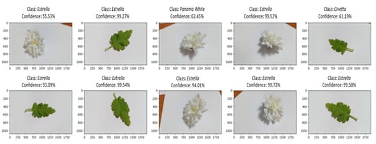 The minor missing classifications were recorded in the leaf cultivar ‘Civetta’ with a confidence level of 61.19% and in the flower type ‘Panama White’ with a confidence level of 62.45%. The reduced confidence in these missing classifications suggests that either the flower or leaf characteristics of the Estrella cultivar differ from those of the Panama White cultivar. Nonetheless, despite the distinction, both Estrella and Panama White cultivars share similarities such as white color and a double type. These similarities underscore that the results do not significantly impact the precise recognition of the Estrella cultivar based on the findings.