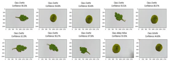 In the case of the Civetta cultivar (Figure 12), the classification results instill a commendable level of confidence in accurately categorizing the majority of flowers and leaves, achieving an accuracy rate exceeding 62%. Notably, there were two instances of missed flower classifications, one in Abbey Yellow with a confidence score of 93% and another in Estrella with a confidence score of 44%. Nevertheless, these occasional discrepancies in flower classification did not impact the overall effectiveness of the cultivar classification process, which exhibited similarly robust performance as observed in the Saffina cultivar.
