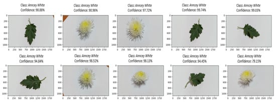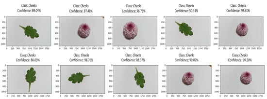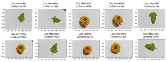 The comprehensive analysis of the model’s performance through ten chrysanthemum cultivars provides visible insights into its capabilities and a few limitations in classifying both flowers and leaves. The testing results indicate a high degree of classification accuracy for most cultivars, with only a few exceptions. We discuss the testing results based on the key recognizing application of the models (Table 3).