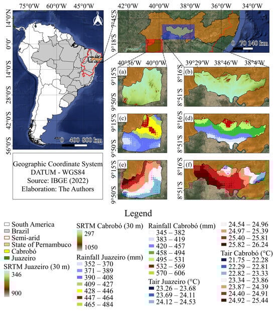 Spatial locations of the districts of Floresta in the state of Pernambuco and Juazeiro in the state of Bahia, Brazil, where the in situ data were collected. SRTM is the Shuttle Radar Topography Mission, and Tair is the air temperature. (a,b)—digital elevation from STRM, (c,d)—annual rainfall, and (e,f)—air temperature.