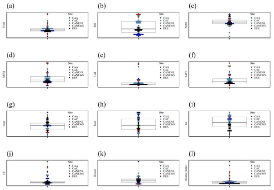 Figure 4 shows the boxplots of the variables obtained employing the satellite images and in situ data. When checking Figure 4a, the values found for DES are in Q1; the limit (Q3) was 0.5771, and Q1 was 0.1176; the median for this variable was 0.2491. The values seen in Figure 4d–f are related to the vegetation indices and characterise the surface DES, which has the lowest values about the other areas, with the values concentrated in Q1 for the three calculated indices NDVI, LAI and SAVI, with a median of 0.27, 0.32 and 0.25, respectively. The highest values for the three indices were found in CANEWS and CANENS, with values of 0.74, 3.77 and 0.32. The lowest values, 0.11, 0.04 and 0.13, were found in DES.