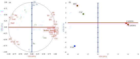 (a) Multivariate principal component analysis of the in situ data (Electrical Conductivity—EC, pH, Calcium—Ca, Organic matter—OM, Phosphorus—P, Potassium—K, Sodium—NA, Carbon—C, Magnesium—Mg, Base Saturation—V, sum of bases—SB, Cation Exchange Capacity—CEC, Copper—Cu, Iron—Fe, organic matter—OM, Field Capacity—FC, Wilting Point—WP, Particle Density—PD, Bulk Density—BD, Clay, Silt, Sand, total porosity—TP, Tsoil—soil temperature, RisDes_Index—proposed model, Rn—net radiation, LE—latent soil heat flux, and β—Bowen ratio) and the orbital products (Leaf Area Index—LAI, Soil Adjusted Vegetation Index—SAVI, Normalised Difference Vegetation Index—NDVI, Surface Albedo, Bare Soil—BSI, Topsoil Grain Size Index—TGSI, and Normalised Difference Salinity Index—NDSI) (b) for five experimental areas: Caatinga (CAA), cactus (CAC), an area under desertification (DES), an area of sugarcane with a ground cover of straw (CANEWS) and an area of sugarcane with no ground cover (CANENS).