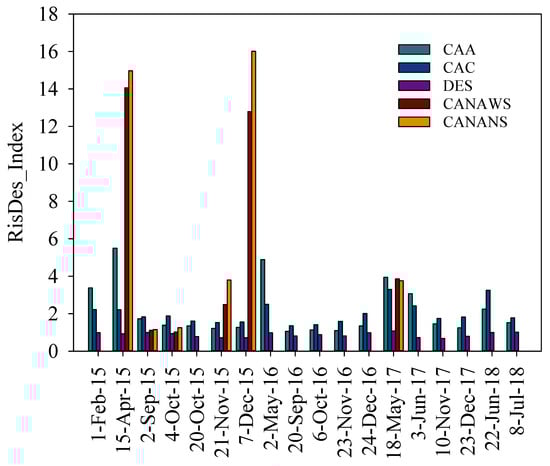 Variation in the values of the RisDes_Index model for the desertified area—DES, for the area of CAM plants—CAC, areas of Caatinga—CAA, irrigated sugarcane with straw—CANEWS, and irrigated sugarcane with no straw—CANENS) from 2015 to 2018.