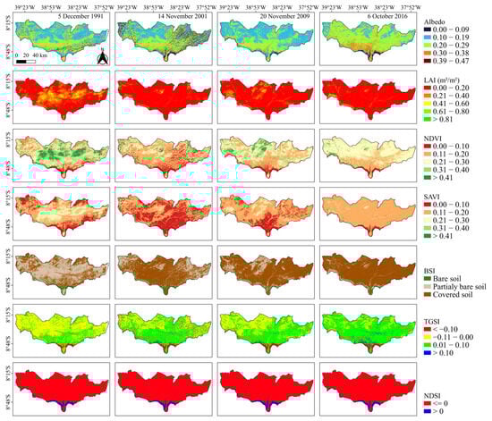 The NDVI, as well as the LAI and SAVI, showed a reduction over time in the study region and, consequently, an increase in albedo. The highest values were seen on 5 December 1991, with around 70% of the area showing a value between 0.3 and 0.9. On the other hand, for 6 October 2016, 67% of the area had NDVI values in the 0.1 and 0.2 range. The bare soil, TGSI and NDSI indices showed an increasing trend, with the bare soil index showing the highest values, with increases reaching 15% between 1991 and 2016. The TGSI, which identifies the amount of fine sand on the surface, increased by 13%, with the greatest values in 2016.