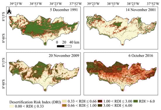Spatial-temporal analysis of the RisDes_Index (RDI) model for the desertification nucleus of Cabrobó, Pernambuco, Brazil for 5 December 1991, 14 November 2001, 20 November 2009 and 6 October 2016.