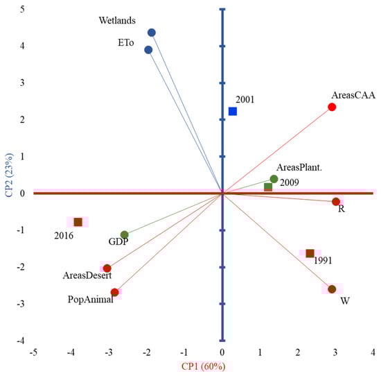 Multivariate principal component analysis of environmental (R—rainfall) and socio-economic variables (AreasDesert—desertified areas; PopAnimal—animal population; GDP—gross domestic product; AreasCAA—areas of Caatinga; Wetlands—wet areas; AreasPlant.—planted areas, W—water balance, 1991—5 December 1991, 2001—14 November 2001, 2009—20 November 2009 and 2016—6 October 2016) for the desertification nucleus of Cabrobó, Pernambuco, Brazil.