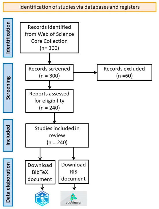 Using these data saved in BibTex and Ris formats (including full records and cited references), a bibliometric analysis was conducted. Following the search, 300 papers were identified, of which 240 were retained to carry out the proposed study. Papers that do not refer to essential oils, those that focused on their antimicrobial activity, the insecticidal activity of other plant-derived compounds, as well as papers referring only to the composition of the essential oils, were excluded from the analysis. The abstract of each paper was analyzed in order to establish whether the content was correlated with the investigated subject. Also, papers published in 2024 were excluded, given the short time that has passed since the beginning of the year, making these results irrelevant for the entire calendar year. A diagram showing the methods of collection, selection and processing of data from WoS [13] is presented in Figure 1.