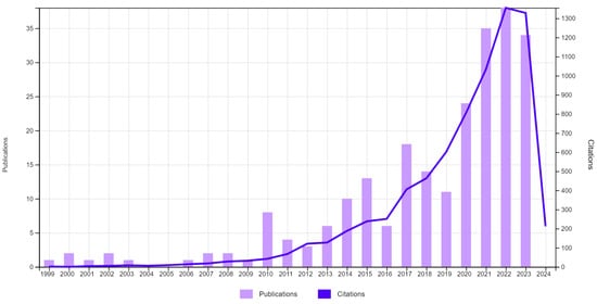 From the analysis of the temporal distribution of papers published in connection with the analyzed subject, we observed a low interest from researchers between 1999 and 2012 (with only 1–2 papers published annually). Between the years 2013 and 2019, there was a moderate increase in the number of works (ranging between 6 and 18), while in the last 4 years (2020–2023), there has been a significant increase in the number of publications (ranging between 22 and 39/year) (Figure 2).