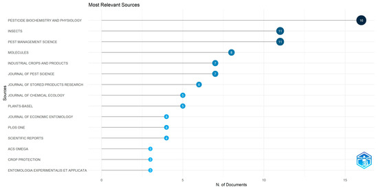 The most relevant sources (top 15 journals) were Pesticide Biochemistry and Physiology, Insects, Pest Management Science, Molecules, Industrial Crops and Products, Journal of Pest Science, Journal of Stored Products Research, Journal of Chemical Ecology, Plants-Basel, Journal of Economic Entomology, Plos One, Scientific Reports, Acs Omega, Crop Protection, Entomologia Experimentalis et Applicata (Figure 3). Of these, seven journals are classifiedin Q1, six journals in Q2 and one in Q3.