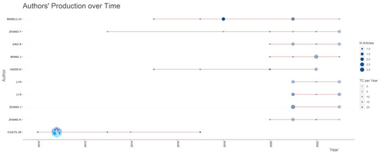 In the group of investigated papers, 1158 authors were identified. Among these, the top 10 authors can be found in Figure 4. This also illustrates the production of the first 10 authors from 2010 (when the author Coats J.R started his work) until now. We notice that 8 out of 10 authors continue their publishing activity. There is an overlap between the top 10 authors and the most prolific countries: 7 authors are institutionally affiliated in China, 1 in Italy (the first author in the top 10), 1 in Brazil and 1 in the USA.