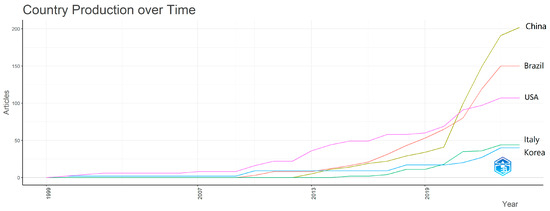 The most prolific countries are China (202 appearances), followed by Brazil (150), USA (107), Italy (44) and South Korea (40). Figure 5 also shows the production of the top 5 countries during the years 1999 and now. If the production of the five countries was initially low and almost equal, after 2009, we can see the detachment of the USA compared to the other four countries. Its dominance lasts until 2021, because starting in 2020, the rapid ascent of China begins, which in the following year overtakes the existing leader at that time.
