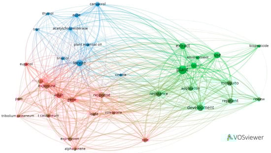 Cluster 1 (red) contains 14 items, the most relevant of which are “adult”, “mortality”, “exposure”, “response” and “gene”. It is focused on the mortality induced by the essential oils in tests performed on insects (one of the secondary terms being “ppm”). Cluster 2 (green) contains 12 items, of which “plant”, “extract”, “development”, “resistance” and “biopesticides” appear more frequently. This cluster predominantly refers to the role of plant extracts used as biopesticides in the fight against harmful insects, as well as their natural or induced resistance to potentially toxic substances they encounter. Cluster 3 (blue) contains nine items that refer, in particular, to components of essential oils, “carvacrol”, “cineole”, “linalool” and “thymol” and their effect on insects. Other keywords represented include “acetylcholinesterase” and “larvae”.