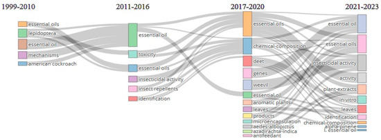 The evolution of research on the mechanisms of action of essential oils on insects can be observed by following the plot in Figure 8. In the first time interval 1999–2010, the number of keywords is lower, in accordance with the reduced number of papers published in that period (Figure 2). Most studies refer to the effects of essential oils on harmful pests in storage [19], where they were easier to apply because closed spaces enhanced the effectiveness of volatile substances compared to open fields. In the period 2011–2016, the emphasis of investigations shifted to the toxicity of essential oils as well as their repellent effect.