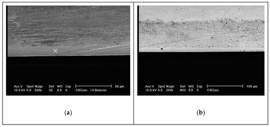 SEM image of the cross-section of the sample thickness. (a) Tantalum carbide; (b) titanium nitride.