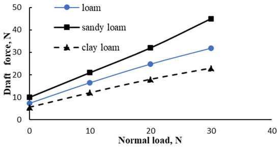 The purpose of this test was to obtain the parameters of the Columbus–Mohr equation (Equation (1)). The line slope and its distance from the origin in the y axis are the soil external friction angle (δ) and adhesion (Ca), respectively. In order to obtain these parameters, at least three tests for each material were conducted, and for each test, a different vertical load was used. Hence, the three loads of 20, 10, and 30 N were used. The maximum amount of draft force was recorded as the draft force, and the draft-normal load diagram was plotted for different soil textures (Figure 6).