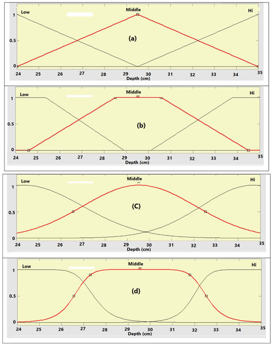 The four most commonly used membership functions, Gaussmf (Gaussian membership function), Trimf (Triangular membership function), Trapmf (Trapezoidal membership function), and Gbellmf (Generalized bell-shaped membership function), are represented as input functions to represent the inputs (Figure 8).