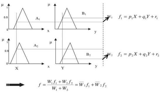 To compute the output parameter, the weight of each rule was specified. The weight was computed in such way that, in each rule, the membership degree of the input signal in the membership functions of each variable was determined, and its minimum value was considered as the weight of the rule. Figure 9 demonstrates this for a network with two inputs.