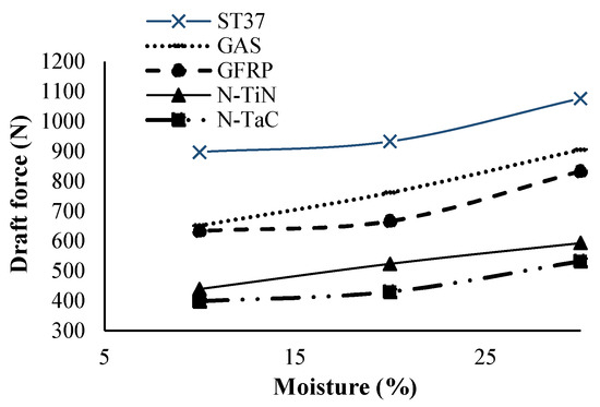 Figure 10 indicates that the blade coated with nano-material required less draft force than any other tool. The draft force increased directly with increasing moisture content for all materials.