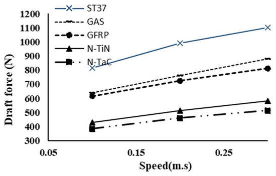 In terms of the regression equations in Table 7, the slope of the draft force changes due to the velocity for st37 blade was 1425, and for the nano-TaC blade, it was 645. Then, it was found that increasing the travel speed was more significant on the draft force of the St37 blade than nano-TiN and nano-TaC blades. Therefore, it was indicated that the nano-coated blades, due to a flat surface area relative to other blades, retained their initial performance, causing a lower draft force increment [34].