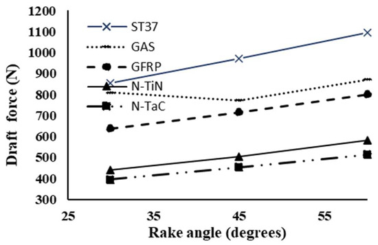 The effect of rake angle on draft force requirement of the tools of different materials.