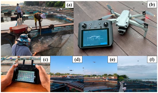 Twenty fish in each cage were randomly selected and weighed using a digital scale 1 day before the UAV flight (a); UAV, DJI Air 2S (Mavic) (b); DJI Smart Controller (c); UAV taking off from the landing station (d); and UAV flying over fish cages (e,f).