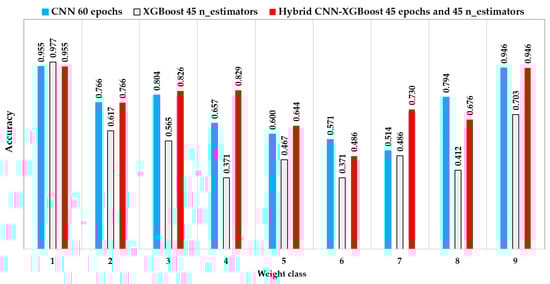 The confusion matrices for all three model types (Figure 3), derived from the best fine-tuning results, revealed consistent accuracy in predicting class 1 weight, accompanied by a notable decrease in accuracy for predicting weights in other classes. Figure 4 shows that the CNN model (60 epochs) revealed accuracy in weights prediction for classes 1–9 at the rate of 0.955, 0.766, 0.804, 0.657, 0.600, 0.571, 0.514, 0.794, and 0.946, respectively. Moreover, the XGBoost model (45 n_estimators) showed accuracies of 0.977, 0.617, 0.565, 0.371, 0.467, 0.371, 0.486, 0.412, and 0.703, respectively. In the meantime, the hybrid model CNN-XGBoost (with epochs and n_estimators of 45) achieved accuracies equivalent to 0.955, 0.766, 0.826, 0.829, 0.644, 0.486, 0.730, 0.676, and 0.946, respectively. These results highlighted the varying degrees of accuracy across different weight classes for each model.