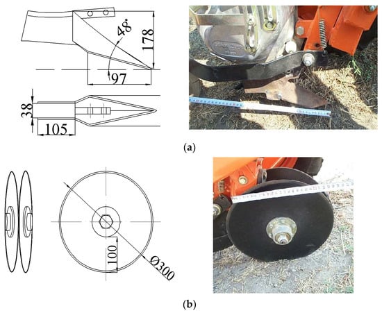 Technical drawings and photos of furrow openers. (a) Hoe-type furrow opener, (b) double-disc-type furrow opener.