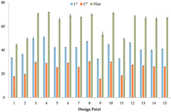 Figure 1 contains the results of the color analysis. The L* coordinate showed considerable variance among the samples, with the design points 9 and 11 having the lowest values (~32) and the design point 4 (~50) having the highest value. A similar trend regarding these samples was also observed in the C* coordinate. The design point 9 gave the lowest value in the C* coordinate (~16), whereas the design point 4 was found among the highest values (~30). However, these values were considerably low, resulting in non-saturated (achromatic) extracts. In the case of hue, most extracts had values above 60, as the majority of the extracts had a greenish-to-brownish color.
