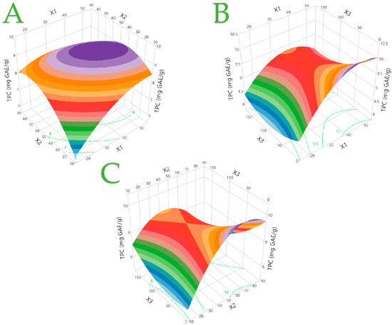 The optimal extraction of the C. sativa extracts is shown in 3D graphs that show the impact of the process variables considered in the response (total polyphenol content—TPC, mg GAE/g). Plot (A), covariation of X1 and X2; plot (B), covariation of X1 and X3; plot (C), covariation of X2 and X3.