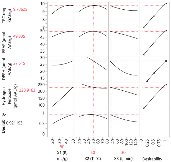 Maximum desirability for all examined variables using the partial least squares (PLS) prediction profiler under the optimal extraction conditions (X1:50, X2:50, X3:30).