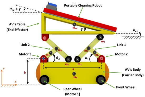 Since the ultimate objective is controlling the AV’s end effector (i.e., the position of the table), the generalized configuration variables can be written as represented by Equation (2).